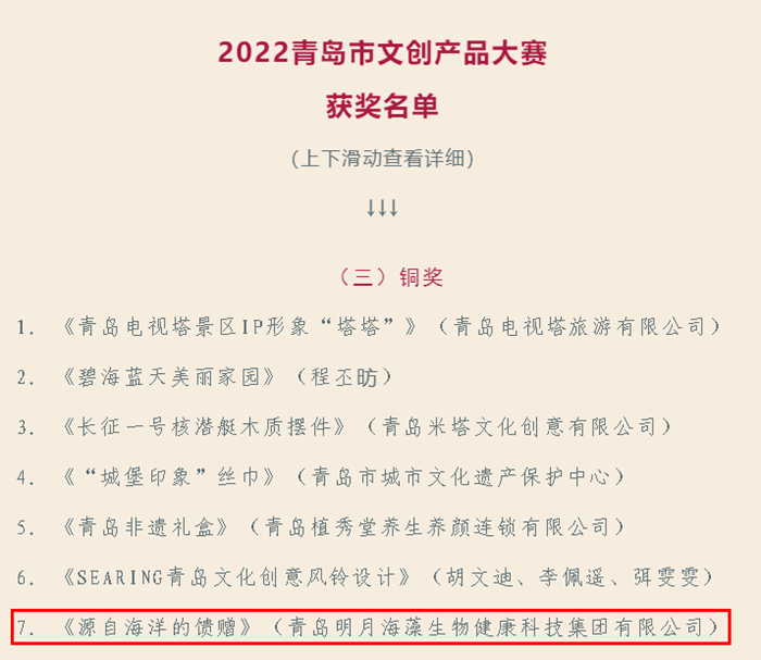 2022年,為保護(hù)、傳承、利用好傳統(tǒng)文化,推動(dòng)優(yōu)秀傳統(tǒng)文化創(chuàng)造性轉(zhuǎn)化、創(chuàng)新性發(fā)展,落實(shí)《“山東手造”推進(jìn)工程實(shí)施方案》,青島市文化和旅游局、青島市廣播電視臺(tái)、青島開放大學(xué)共同啟動(dòng)“山東手造 青島有禮”2022青島市文創(chuàng)產(chǎn)品大賽。經(jīng)過(guò)網(wǎng)絡(luò)線上投票,11月26日,最終評(píng)選出“2022青島市特色伴手禮”十項(xiàng),金獎(jiǎng)10件、銀獎(jiǎng)21件、銅獎(jiǎng)32件及優(yōu)秀獎(jiǎng)94項(xiàng)。青島明月海藻生物健康科技集團(tuán)有限公司文創(chuàng)產(chǎn)品《源自海洋的饋贈(zèng)》榮獲設(shè)計(jì)類銅獎(jiǎng)。