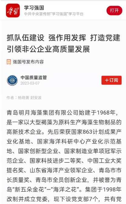 黨建強(qiáng),企業(yè)強(qiáng)。做好黨建工作,是廣大民營(yíng)企業(yè)良性向好發(fā)展的成功密碼。青島明月海藻集團(tuán)自1998年改制之初,即成立了集團(tuán)黨委,25年來(lái),集團(tuán)始終堅(jiān)持“圍繞生產(chǎn)抓黨建,抓好黨建促發(fā)展”的工作原則,積極深化學(xué)習(xí)教育,筑牢思想根基,全力推進(jìn)黨建與經(jīng)營(yíng)同頻共振,更感受到黨建成果真抓實(shí)干所釋放出來(lái)的強(qiáng)大動(dòng)能,構(gòu)建了獨(dú)具明月特色的“藍(lán)色強(qiáng)企”黨建格局。
