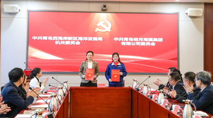區(qū)海洋發(fā)展局機關(guān)黨委副書記王淑芳,青島明月海藻集團工會副主席、黨政辦公室總監(jiān)楊曉菁,分別代表雙方黨委簽約。