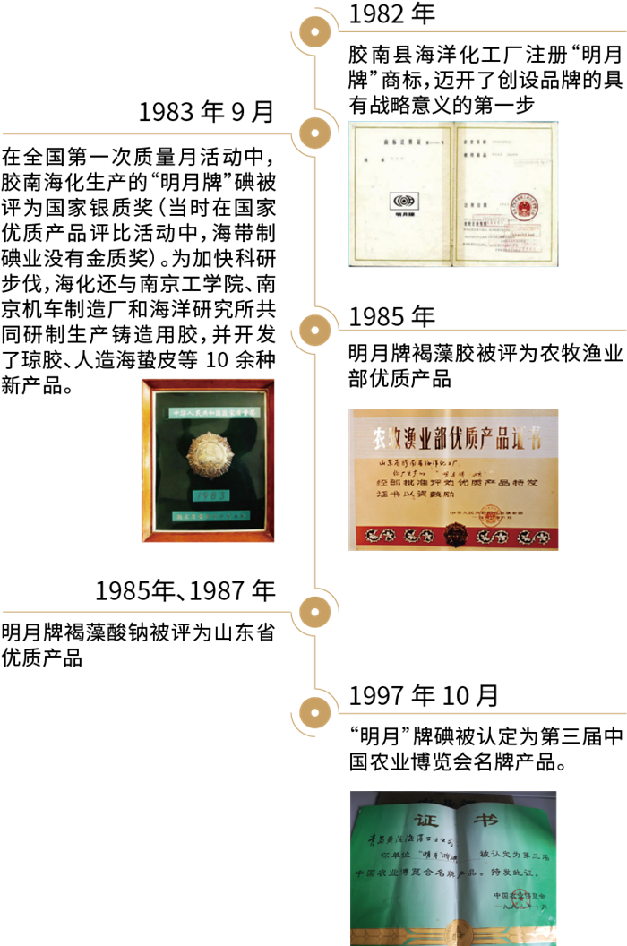 膠南縣海洋化工廠自籌建創始起,就高度重視新技術、新工藝、新產品和新品牌的研發創造,形成了注重技術改造、致力產品創新的傳統精神,并首創了一個美麗溫馨、蘊涵豐富、意義深遠的品牌——“明月牌”制碘產品。