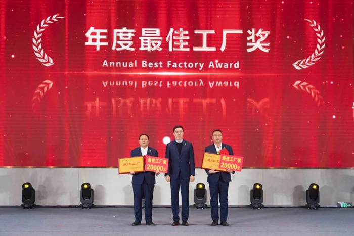 青島西海岸新區人大常委會副主任、總工會主席唐恩志,集團黨委書記、董事局主席張國防為一等獎獲獎單位代表頒獎