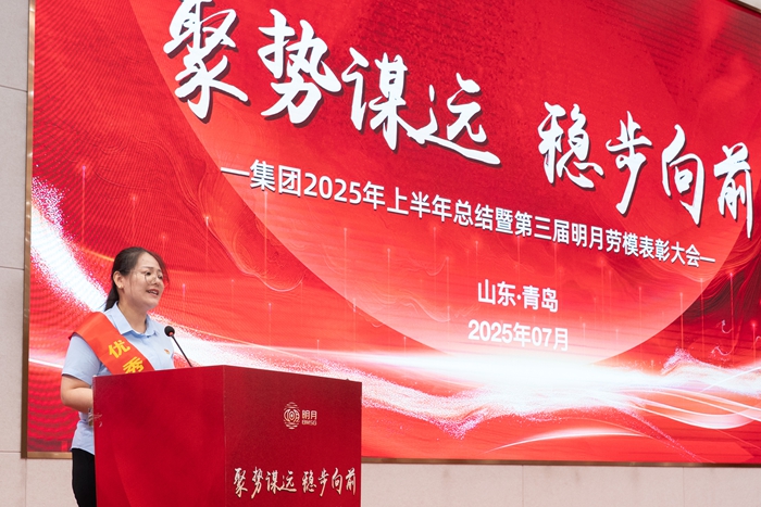 集團工會主席楊曉菁宣讀《中共青島明月海藻集團有限公司委員會、青島明月海藻集團有限公司工會委員會關于表彰第三屆明月勞動模范的決定》。勞模主題視頻《平凡之路,匠心筑夢》、《堅守如磐,微光成炬》生動展現了莊淑云、陳玉奇兩位第三屆明月勞模數十年如一日的默默堅守,以點滴微光匯聚創新力量,在平凡崗位上追求極致的“工匠精神”。陳玉奇代表勞模發言,表達了將繼續扎根崗位、銳意創新、甘于奉獻,為集團“聚勢謀遠”貢獻全部力量的堅定決心。