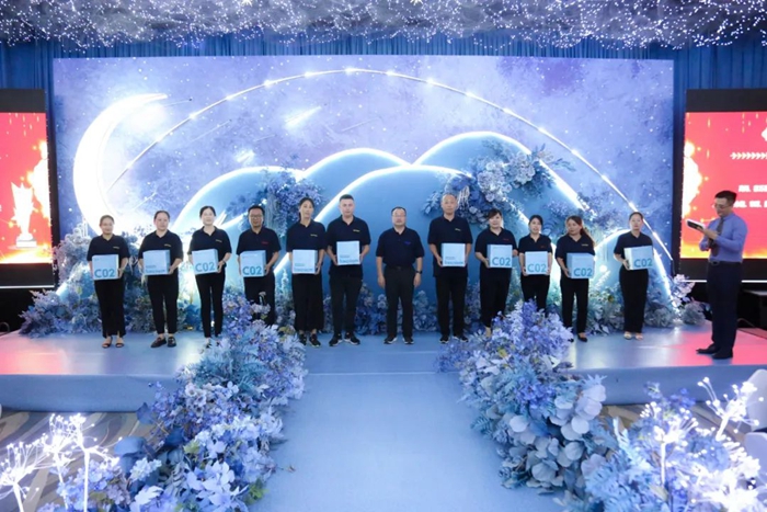 慶典上,明月海藻集團總裁劉兆志為明月醫材十年老員工頒獎。董事局主席張國防為明月醫材“雙十周年”(進集團10年以上,同時進生物醫用材料也10年以上)老員工頒獎并致辭。