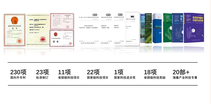 明月海藻集團(tuán)獲得國(guó)內(nèi)外專利 230 項(xiàng),主持和參與制訂各類行業(yè)、國(guó)家標(biāo)準(zhǔn) 23 項(xiàng),承擔(dān)省部級(jí)科技項(xiàng)目 11 項(xiàng),國(guó)家級(jí)科技項(xiàng)目 22 項(xiàng);獲國(guó)家科技進(jìn)步獎(jiǎng) 1 項(xiàng),省部級(jí)科技獎(jiǎng)勵(lì) 18項(xiàng);出版海藻產(chǎn)業(yè)科技專著 20 余部。